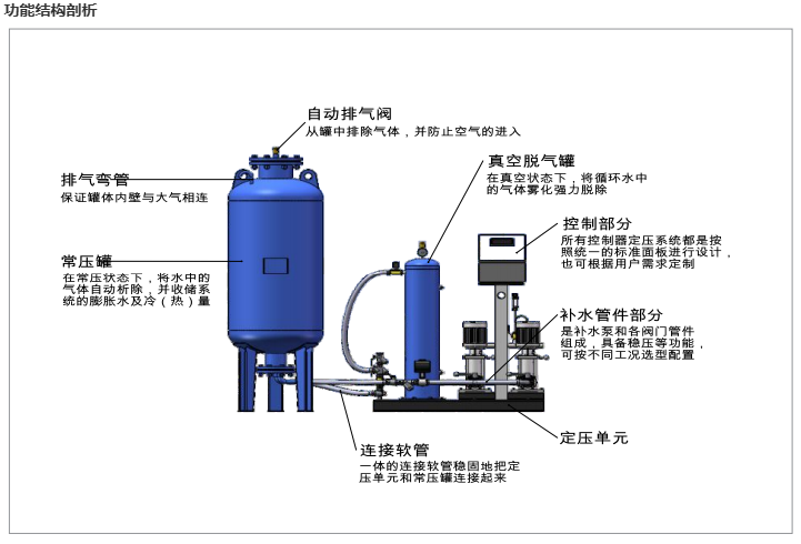 1、自動定(dìng)壓,自動補水,自動泄(xiè)水,自動脫除係統內遊離氣體,溶解氣體。