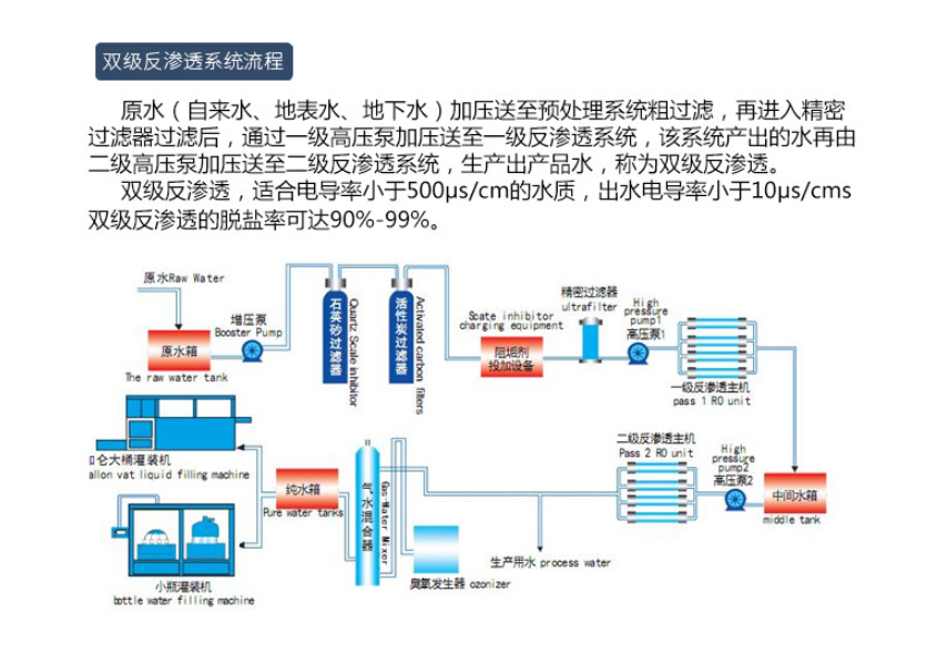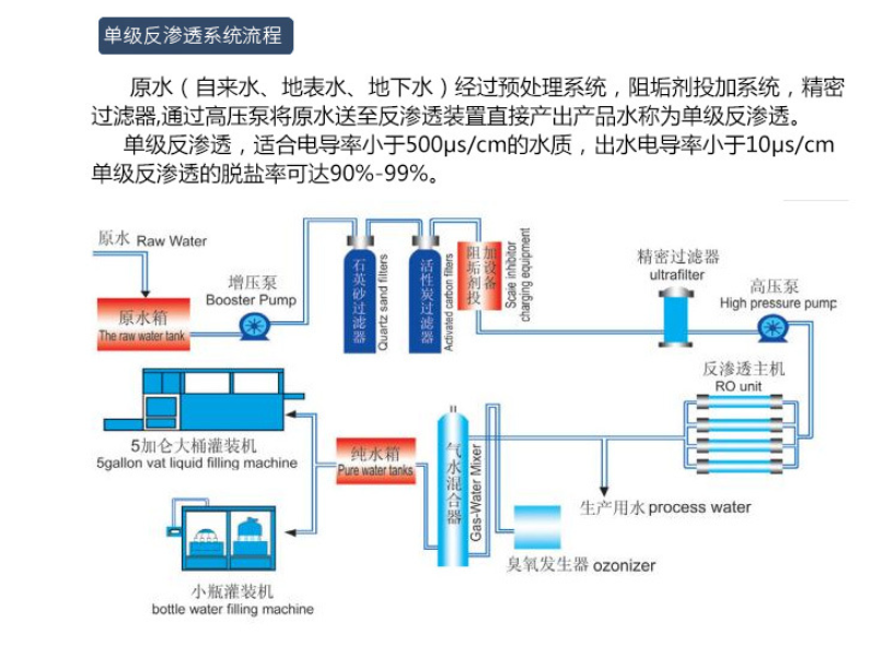 反滲透過(guò)程是所有使用過濾方法中精細的過濾方式(shì).反滲透膜像一個屏(píng)障阻礙了(le)可溶性鹽和無機分子,以及分子重量(liàng)大於100的有機(jī)分子的通(tōng)過.另一方麵,水分子自由通過膜後形成了一條產水水(shuǐ)流。反滲透(tòu)係統標準脫鹽(yán)率可以達到99%以上。